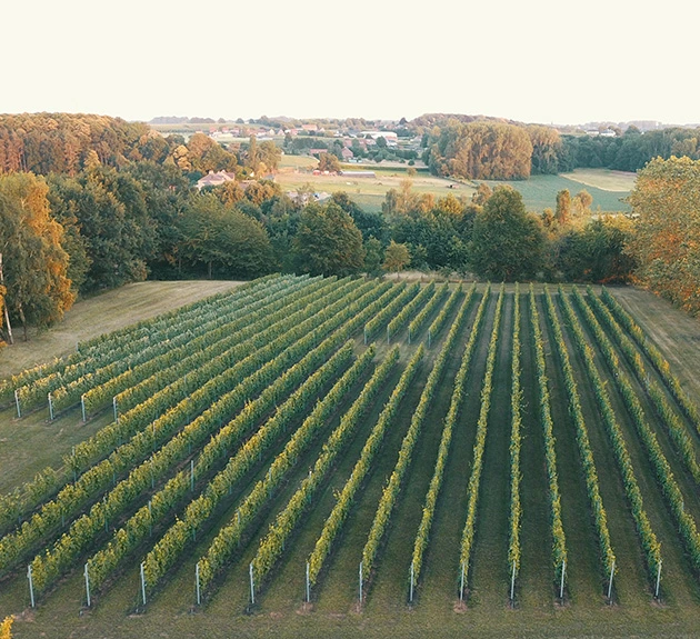 In het hart van het Hageland, in Tielt-Winge, ligt onze wijngaard op een zacht glooiende helling met een oriëntatie van oost naar zuid. Deze ligging zorgt voor optimale zoninval en een geleidelijke rijping van de druiven.